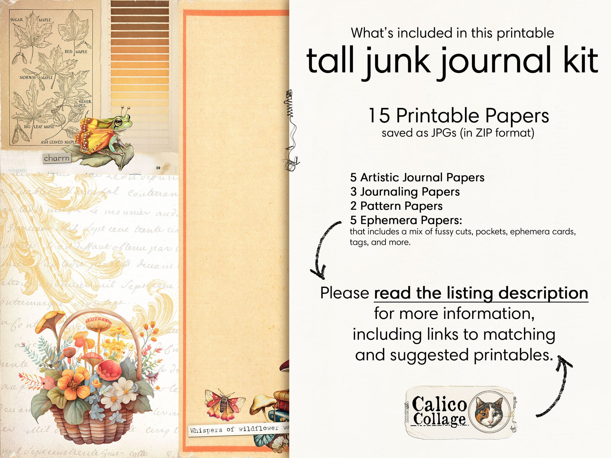 🖨️ Immerse yourself in the cozy charm of Autumn Cottagecore with our printable junk journal kit designed for a 4.25x11 inch journal. This enchanting kit captures the essence of the season, adorned with vintage tans, reds, and oranges hues. Discover a whimsical world of stacked books, graceful moths, baskets of wildflowers, and mushrooms—each element carefully curated to evoke a sense of nostalgia and nature's beauty. Let your creativity flourish as you fill the pages of your journal with these delightful elements, capturing the magic of Autumn Cottagecore. Print at home and embark on a journey into a quaint and enchanting cottagecore world, preserving the charm of the season within your very own junk journal.