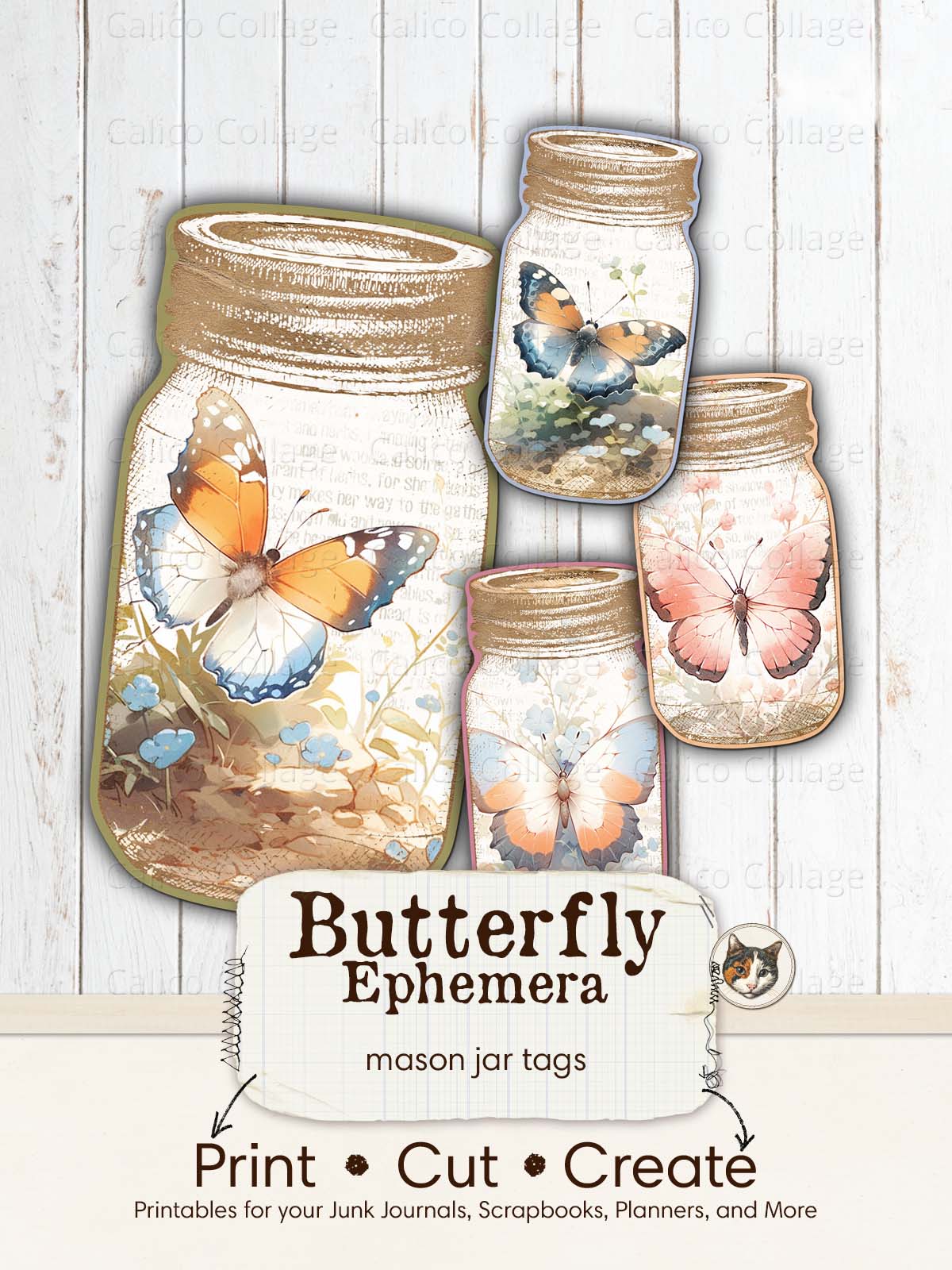 🖨️ Discover the charm of these Butterfly Ephemera Mason Jar Tags, inspired by Beatrix Potter's enchanting art. Each tag, shaped like a quaint mason jar, features whimsical butterfly illustrations that exude soft elegance and storybook charm. Perfect for enhancing junk journaling projects or adding a magical touch to gifts and scrapbooks, these tags bring a flutter of sweetness and creativity to any endeavor.