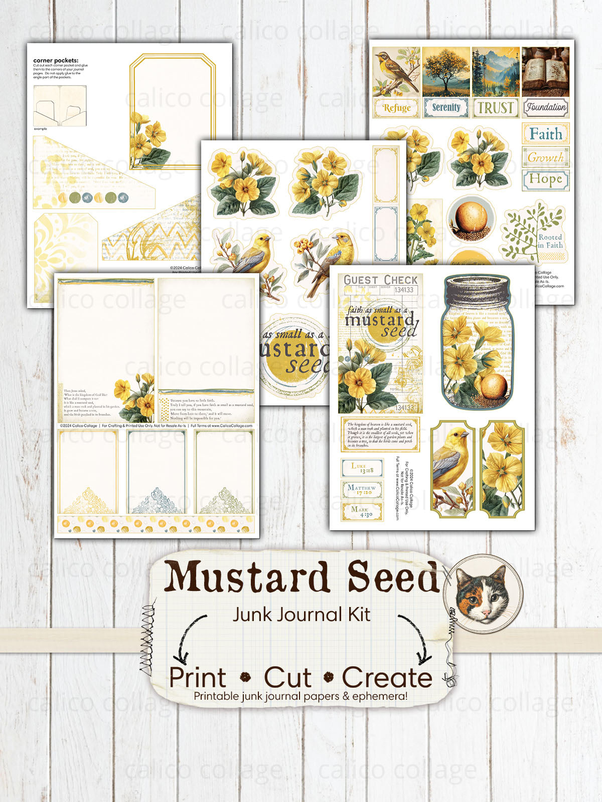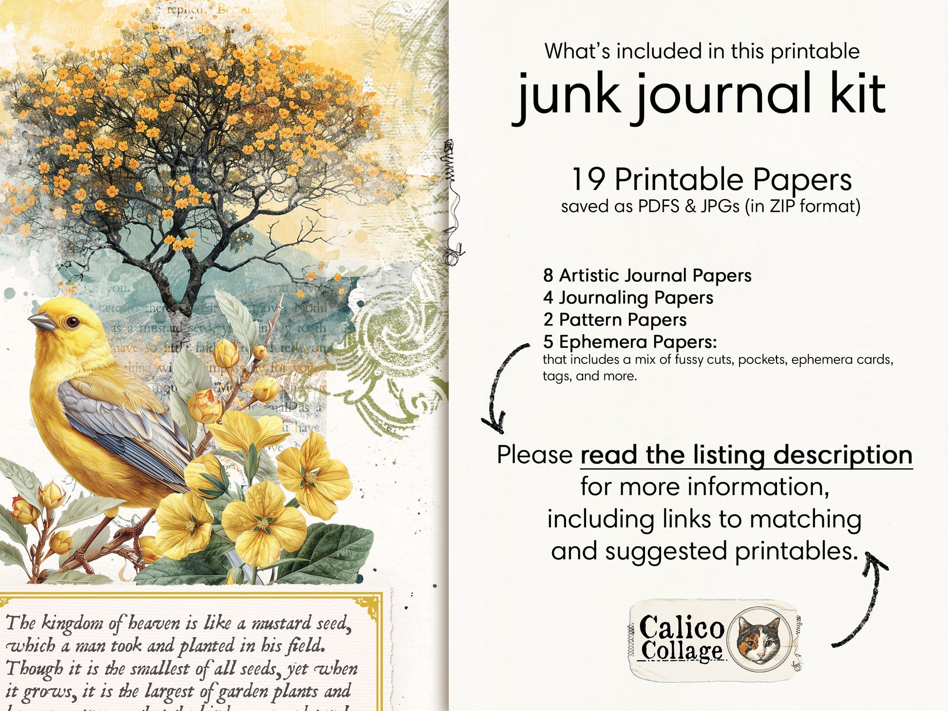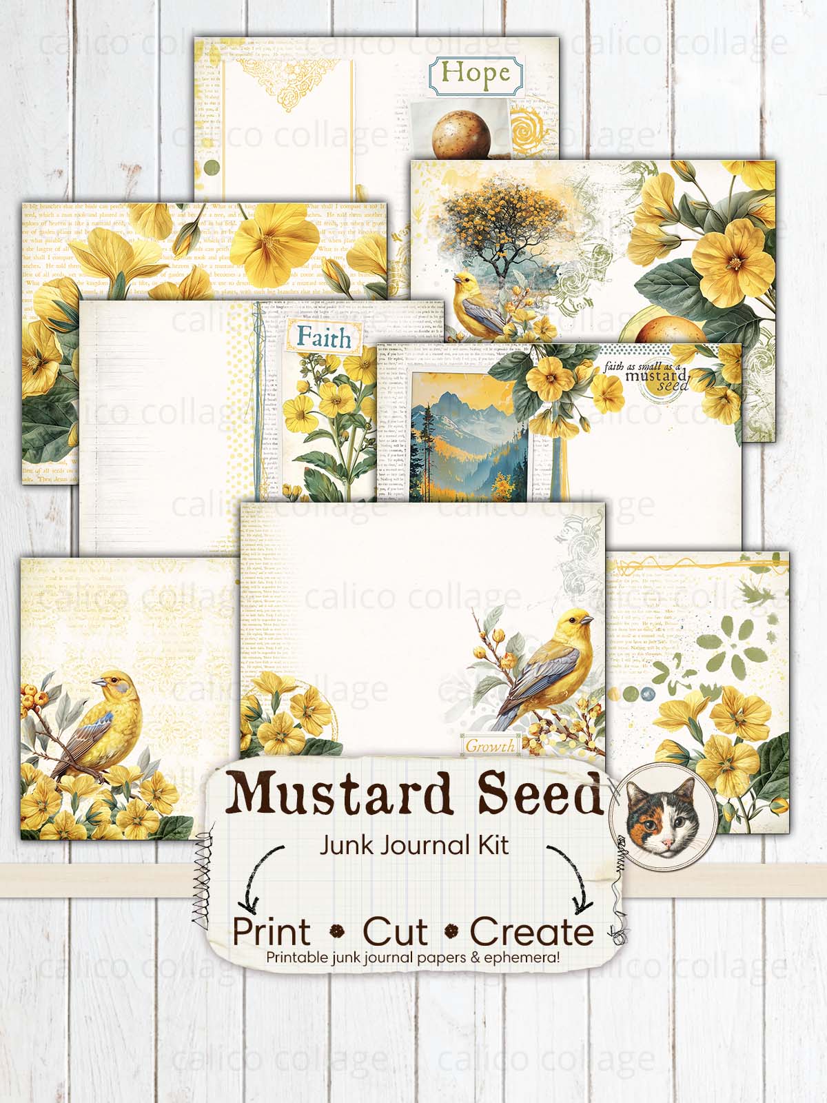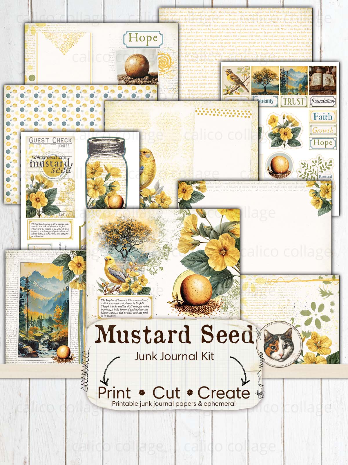 🖨️ Start your spiritual journey with this Faith Junk Journal Printable, inspired by the theme "Faith as Small as a Mustard Seed." This religious junk journal kit, available as a Digital Download, blossoms in vibrant shades of yellow and green, featuring delicate illustrations of yellow flowers and birds. Perfect for reflecting on growth and faith, the Mustard Seed Junk Journal kit invites you to document your reflections and inspirations in a beautifully themed setting, enhancing your devotion through the art of journaling.