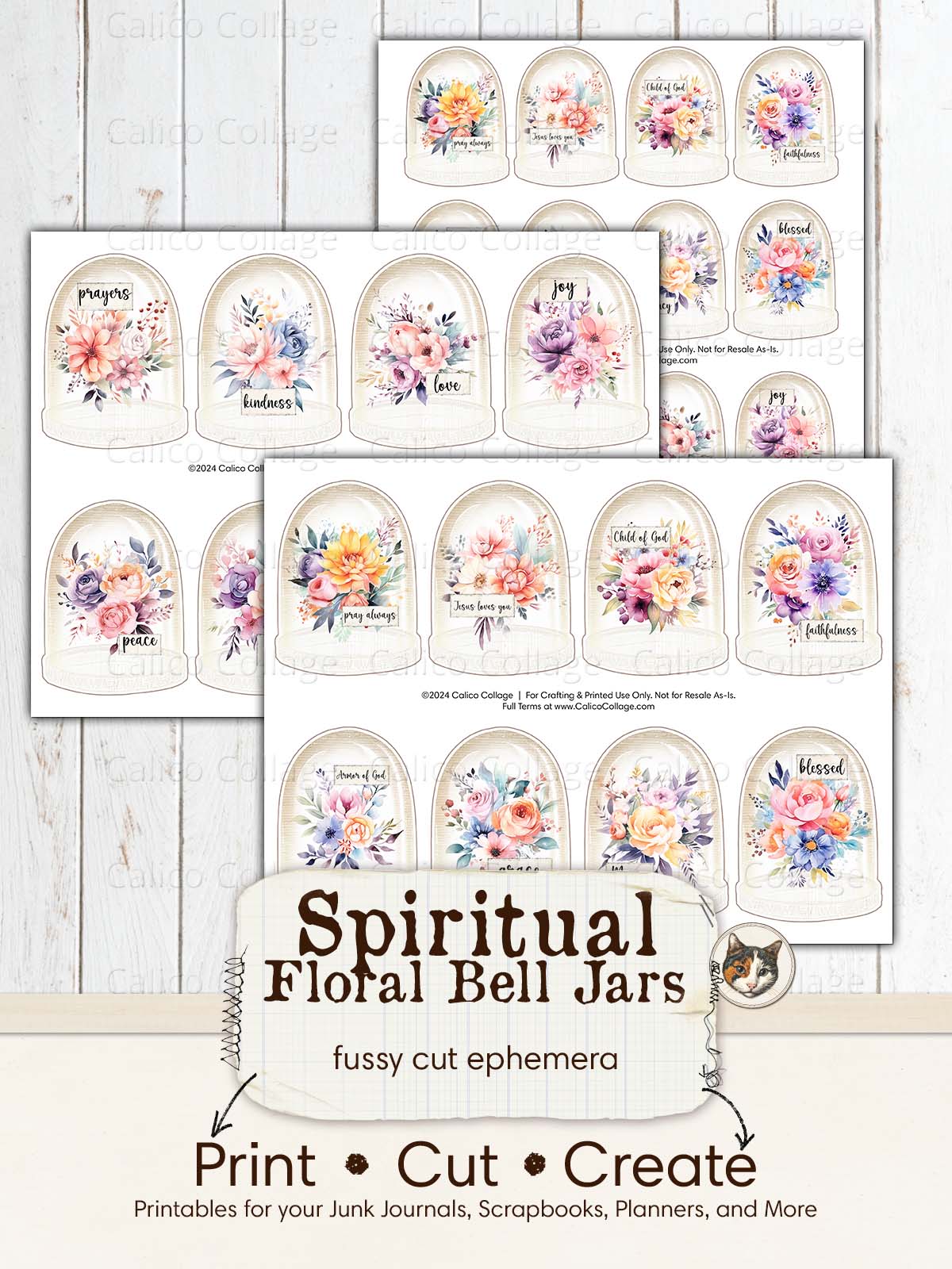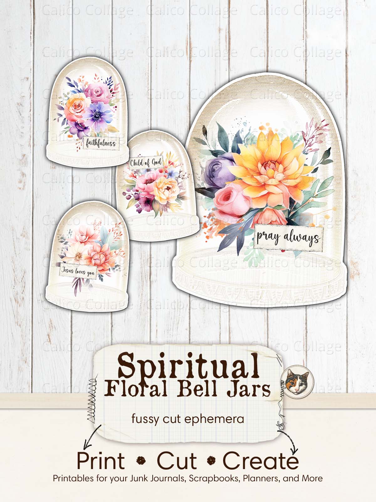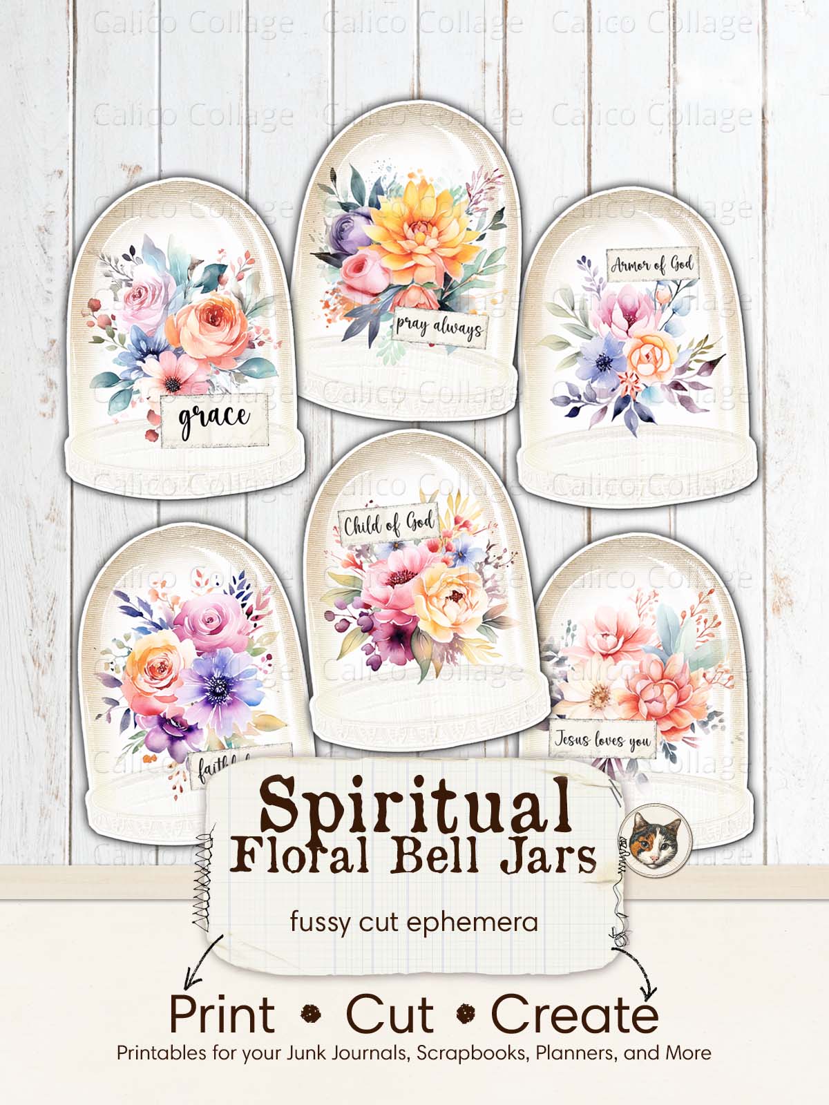 🖨️ Begin your spiritual crafting journey with this Faith Junk Journal Printable, featuring serene Flower Bell Jar Fussy Cuts adorned with profound religious words like Jesus, Faith, and Child of God. Designed to harmonize with the Bloom in Grace junk journal kit, these printables merge the elegance of florals in bell jars with the depth of Religious Ephemera, creating a space for reflection and inspiration. Perfect for those looking to deepen their faith through journaling, these pieces offer a beautiful way to incorporate spiritual reminders into your daily life.