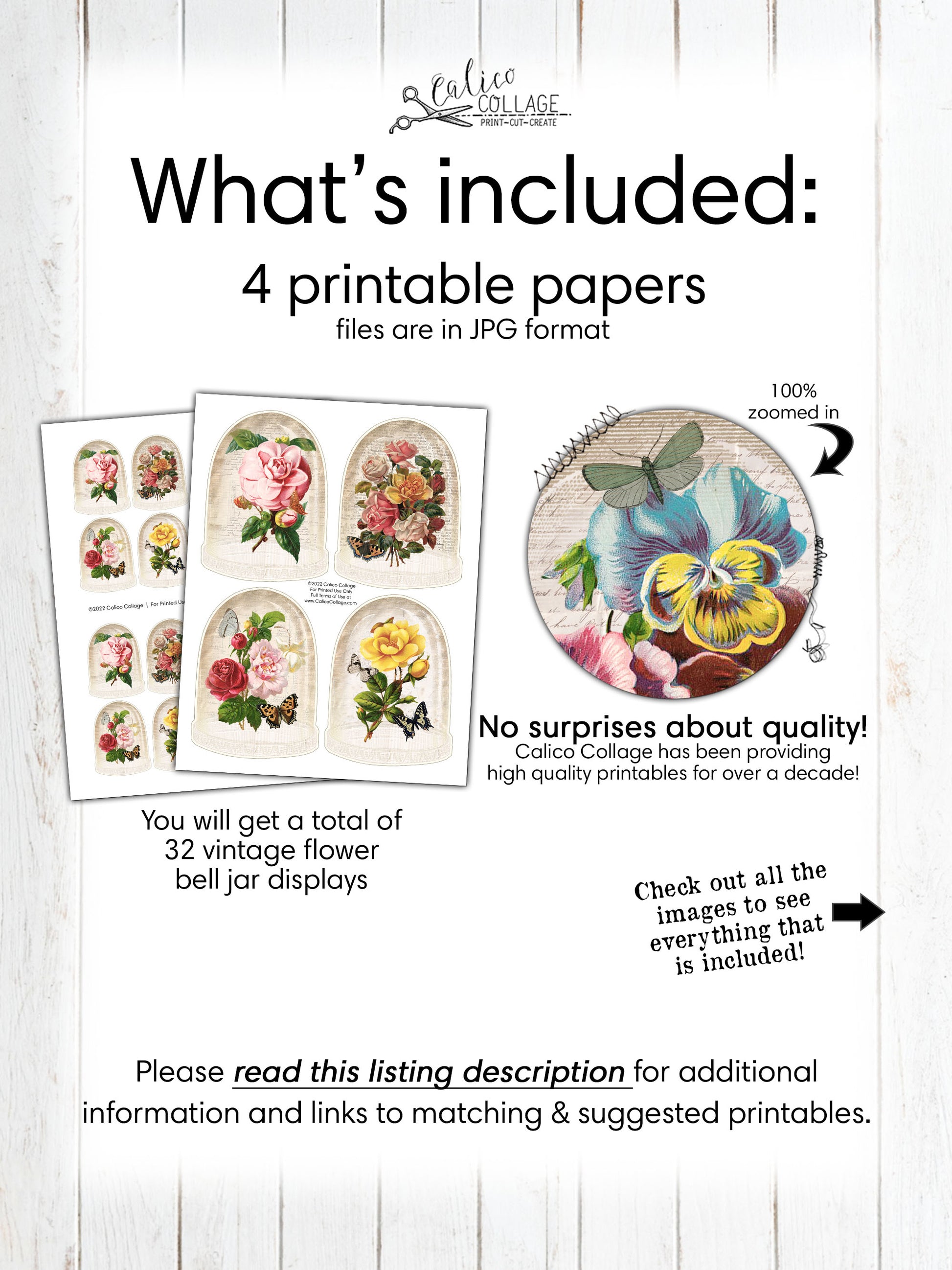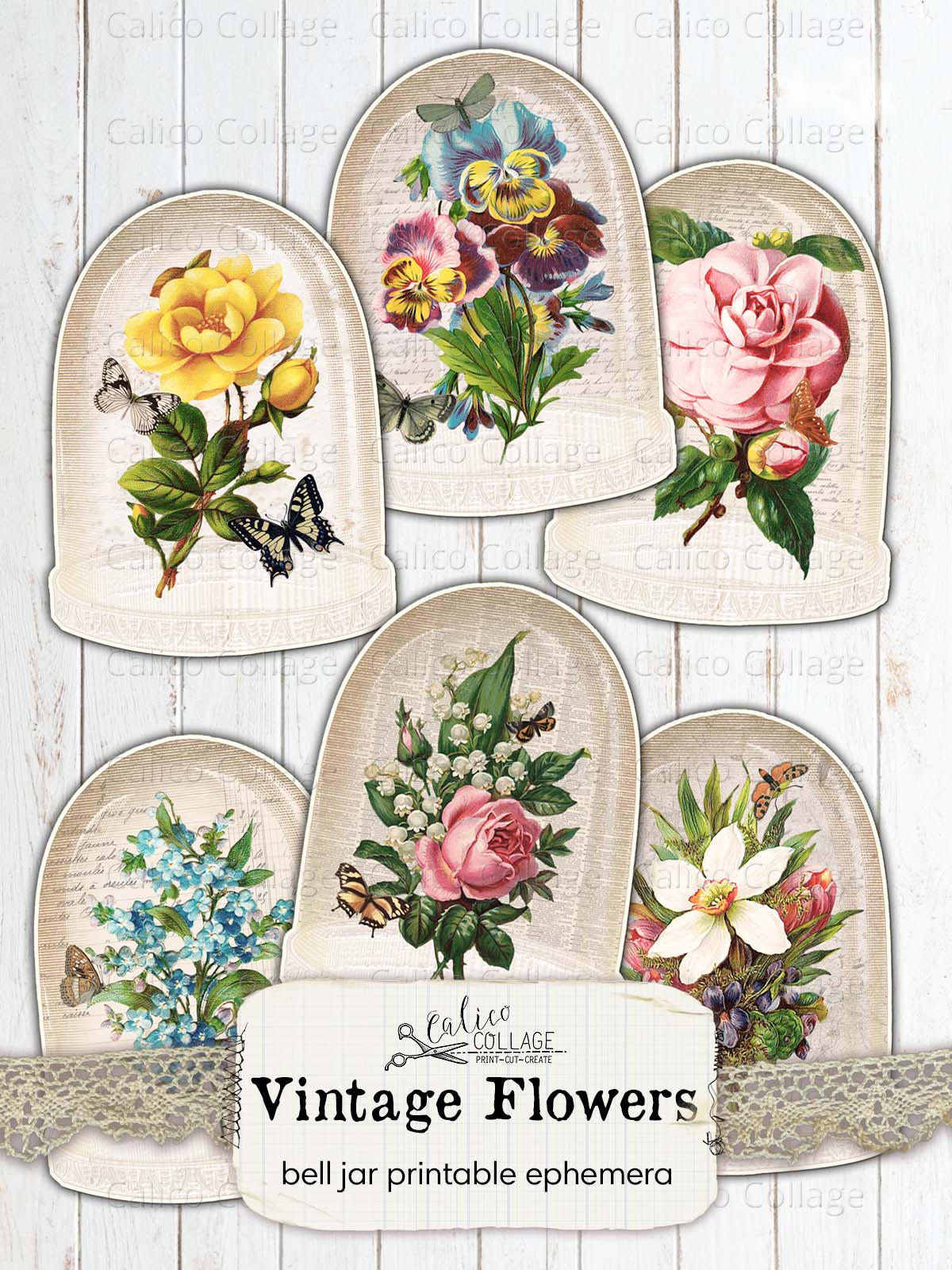 🖨️This set of junk journal printables are adorable Flower Bell Jar Displays. These unique junk journal printables would be perfect for many different paper crafts such as physical ephemera, mixed media, junk journals, bullet journals, vintage journals, hangtags and so much more! Let your awe-inspiring imagination play!