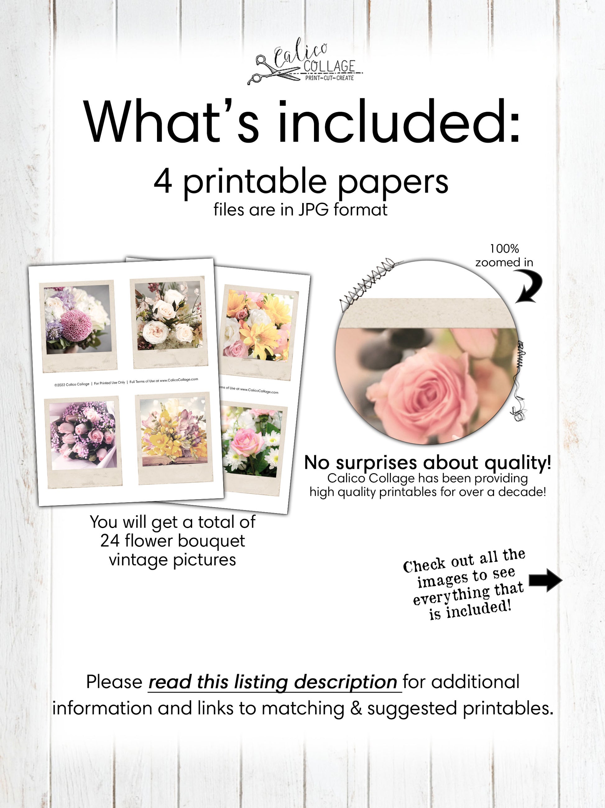 🖨️Wonderful junk journal printable flower bouquet pictures. These unique printables would be perfect for many different paper crafts such as physical ephemera, mixed media, junk journals, bullet journals, vintage journals, hangtags and so much more! Let your awe-inspiring imagination play!