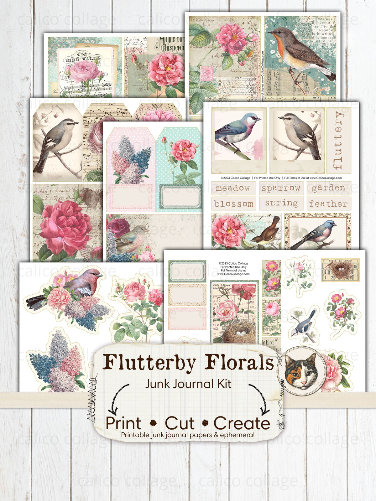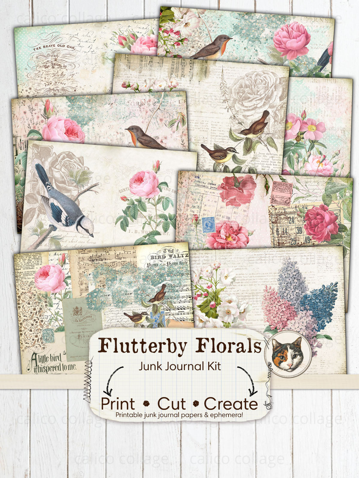 Flutterby Florals Junk Journal Kit, Bird Ephemera