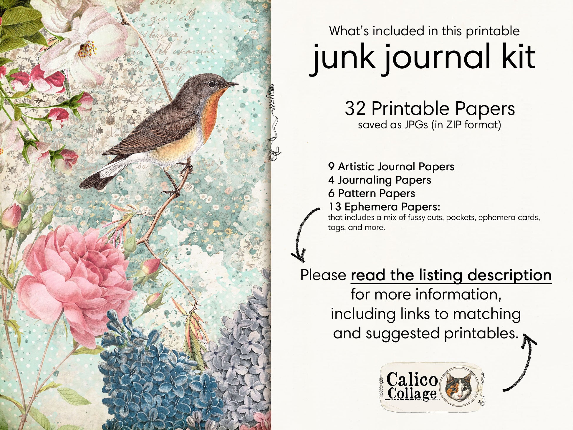 🖨️ Introducing a charming vintage bird junk journal kit, adorned with delightful birds and flowers. Effortlessly create a unique junk journal by folding the included pages in half and enhancing them with the provided ephemera as decorative accents. This versatile kit is also perfect for various paper craft projects, such as glue books, scrapbooking, travel diaries, and more.