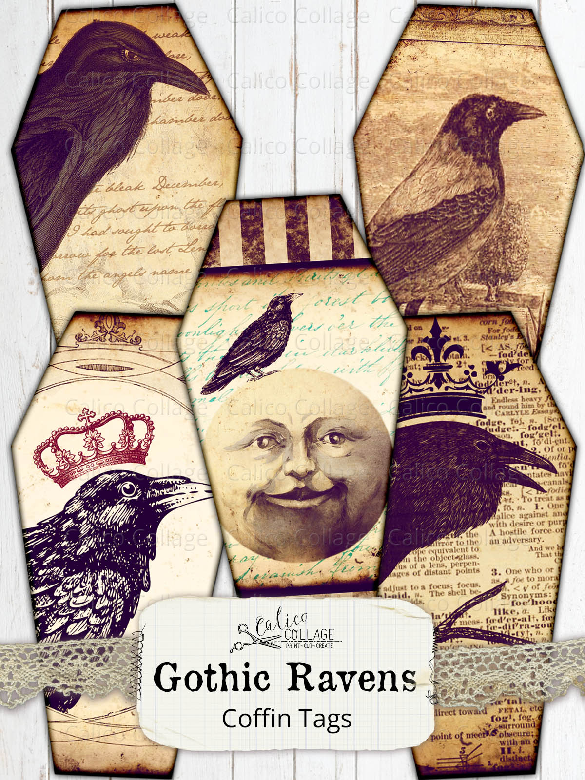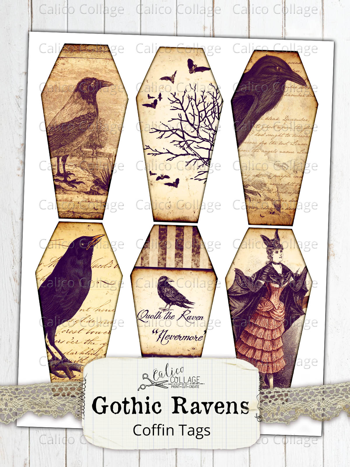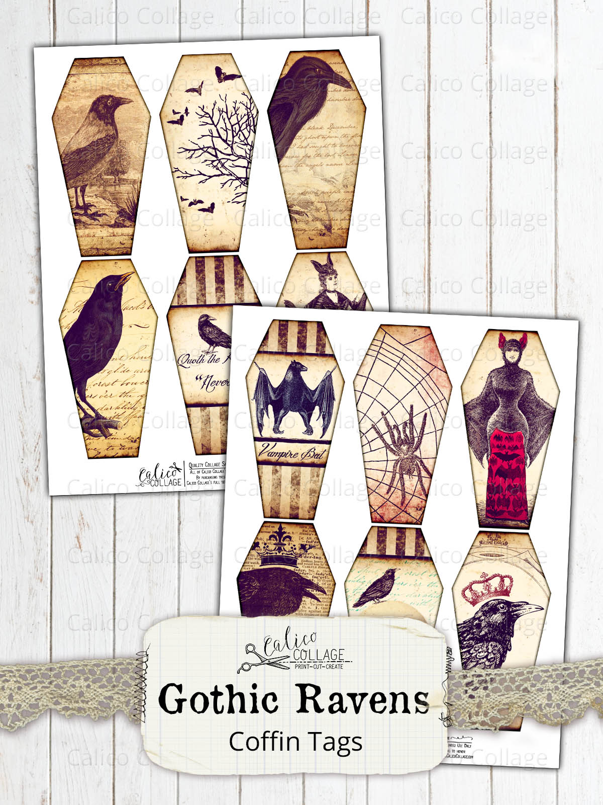 Printable Gothic Raven Coffin Tags, Junk Journal Supplies