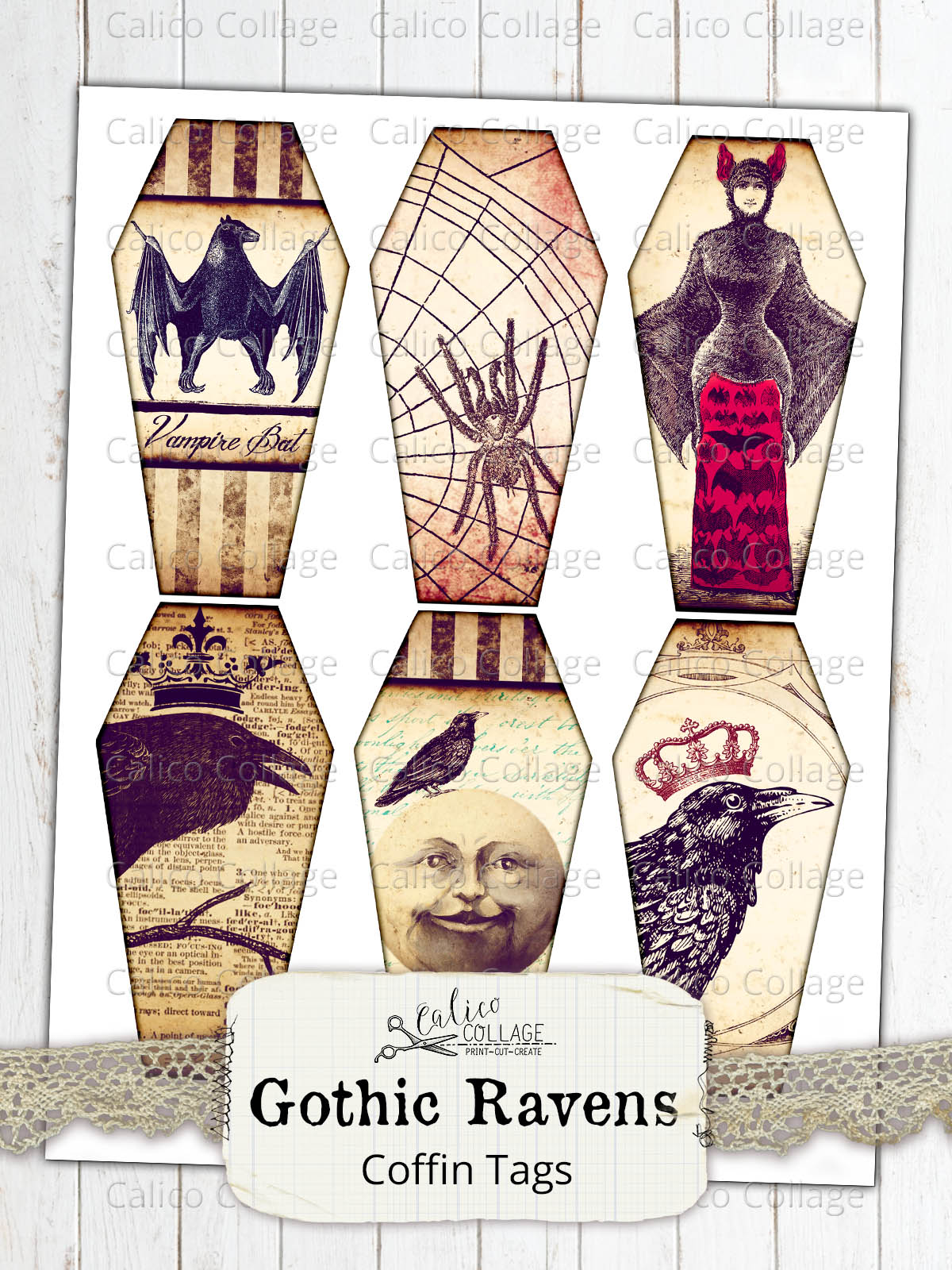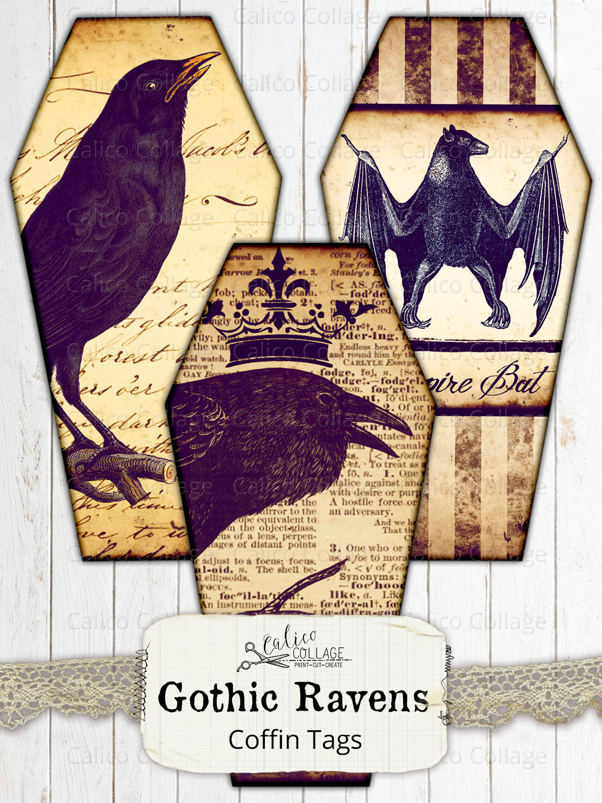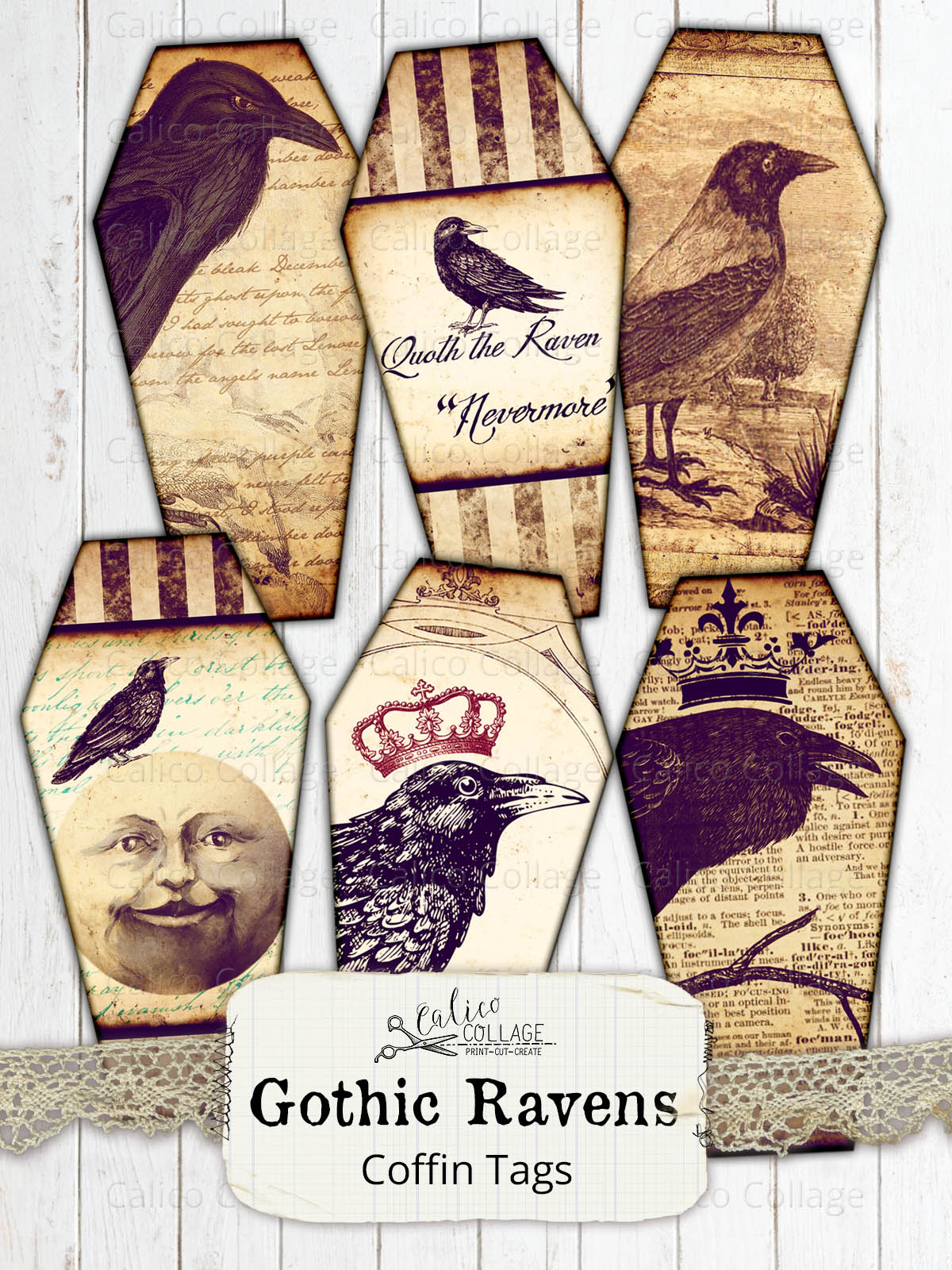 Printable Gothic Raven Coffin Tags, Junk Journal Supplies