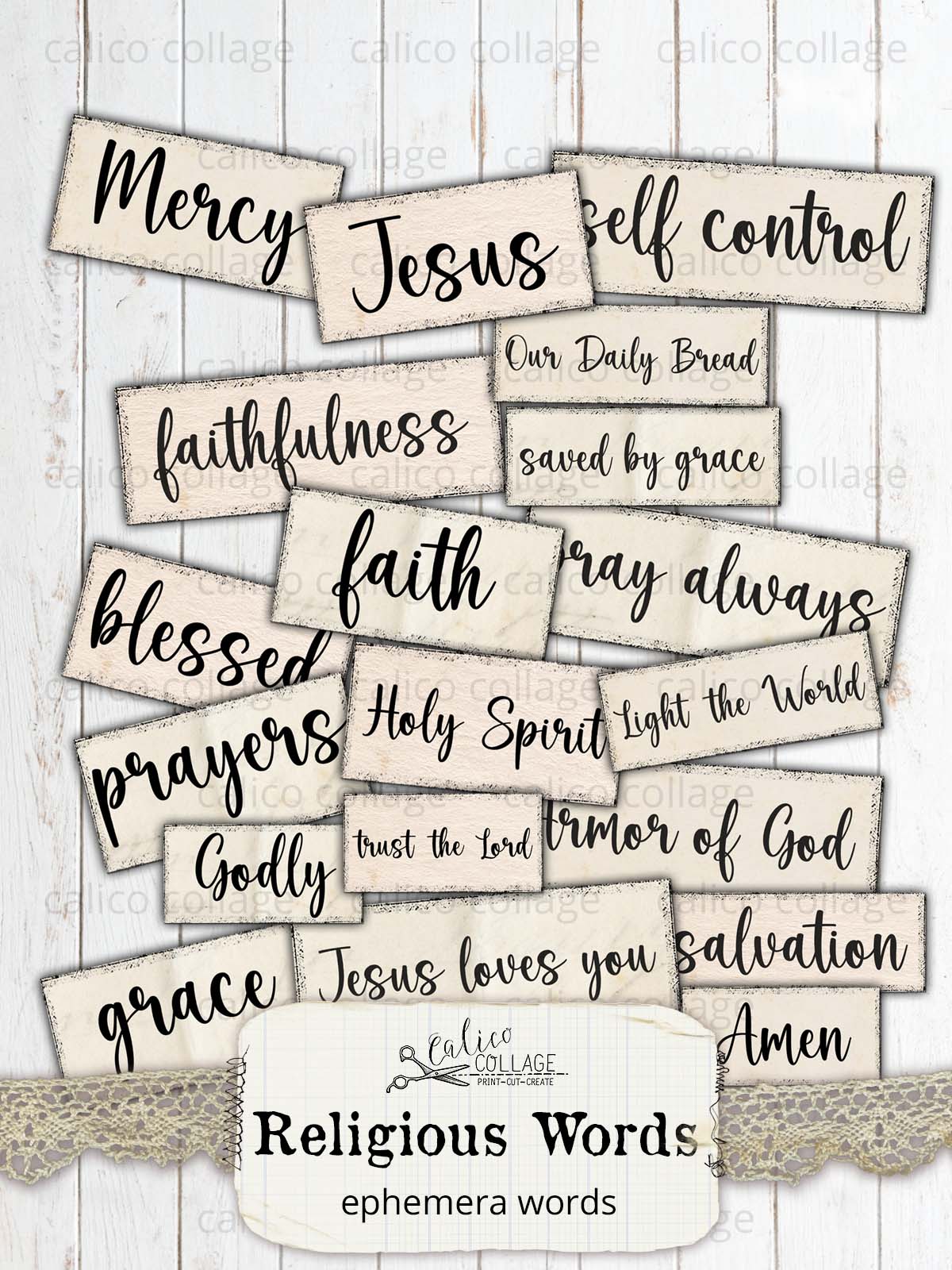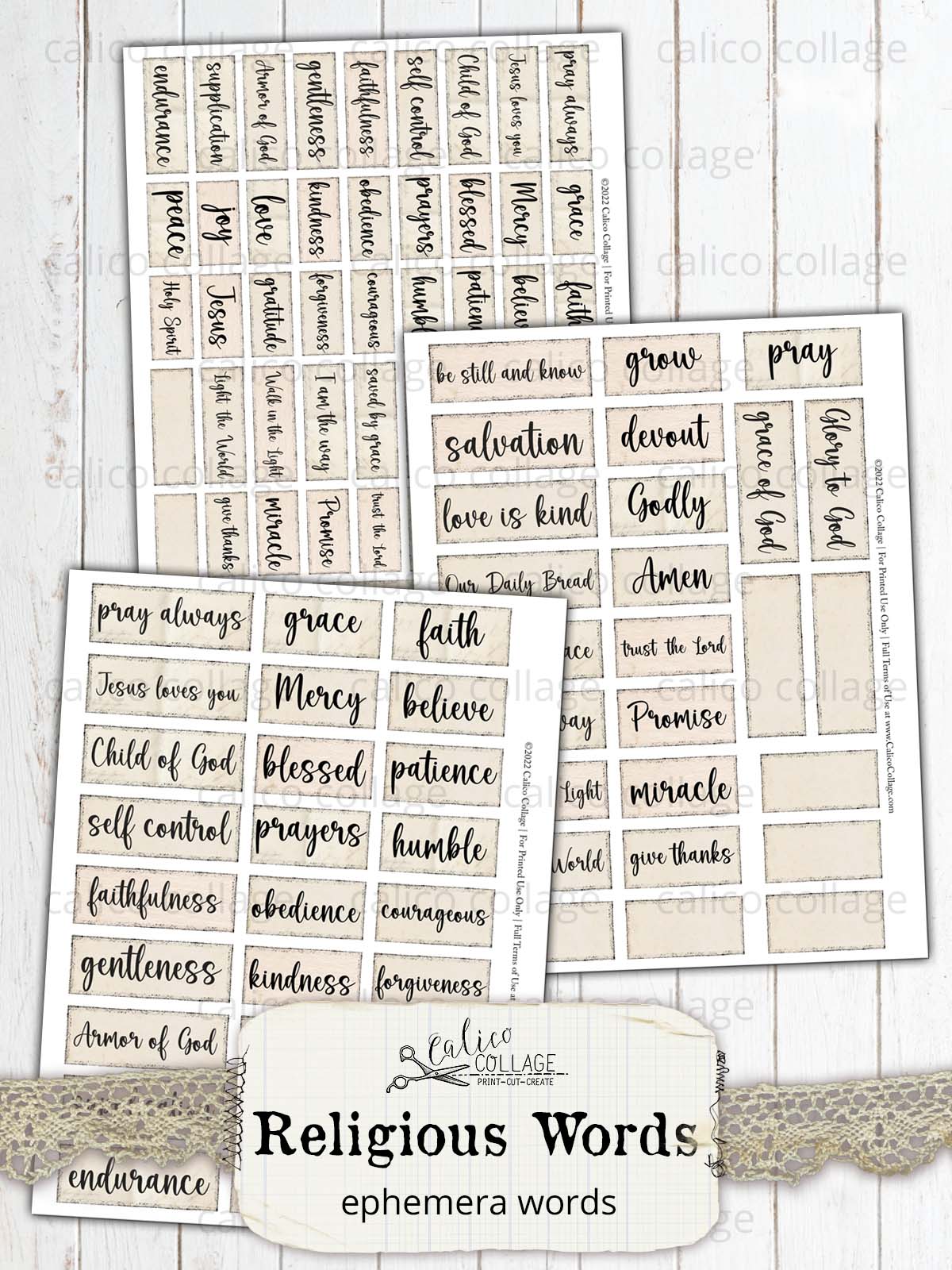 🖨️These printable religious junk journal ephemera words are in 4 different sizes. These unique printables would be perfect for many different paper crafts such as physical ephemera, mixed media, junk journals, bullet journals, vintage journals, hang tags and so much more! Let your awe-inspiring imagination play!