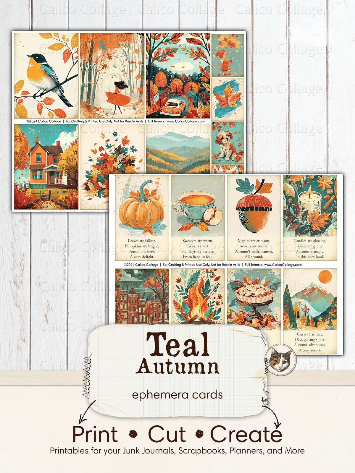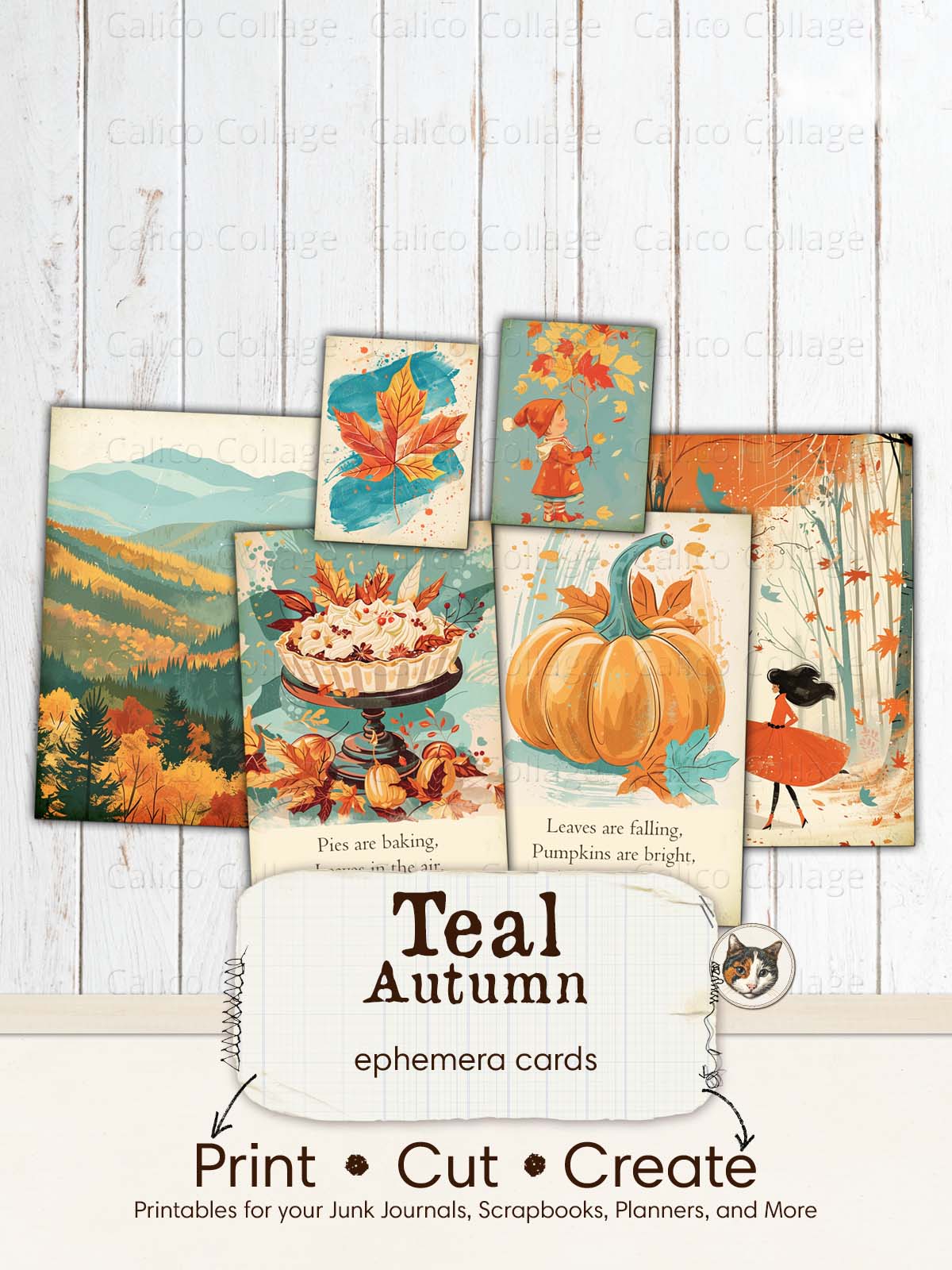 🖨️ Add a touch of fall to your projects with the "Teal Autumn" Ephemera Cards. These printable cards feature charming autumn designs in teal and orange, perfect for junk journals, scrapbooks, planners, and more. Print, cut, and create beautiful seasonal accents for your crafts!