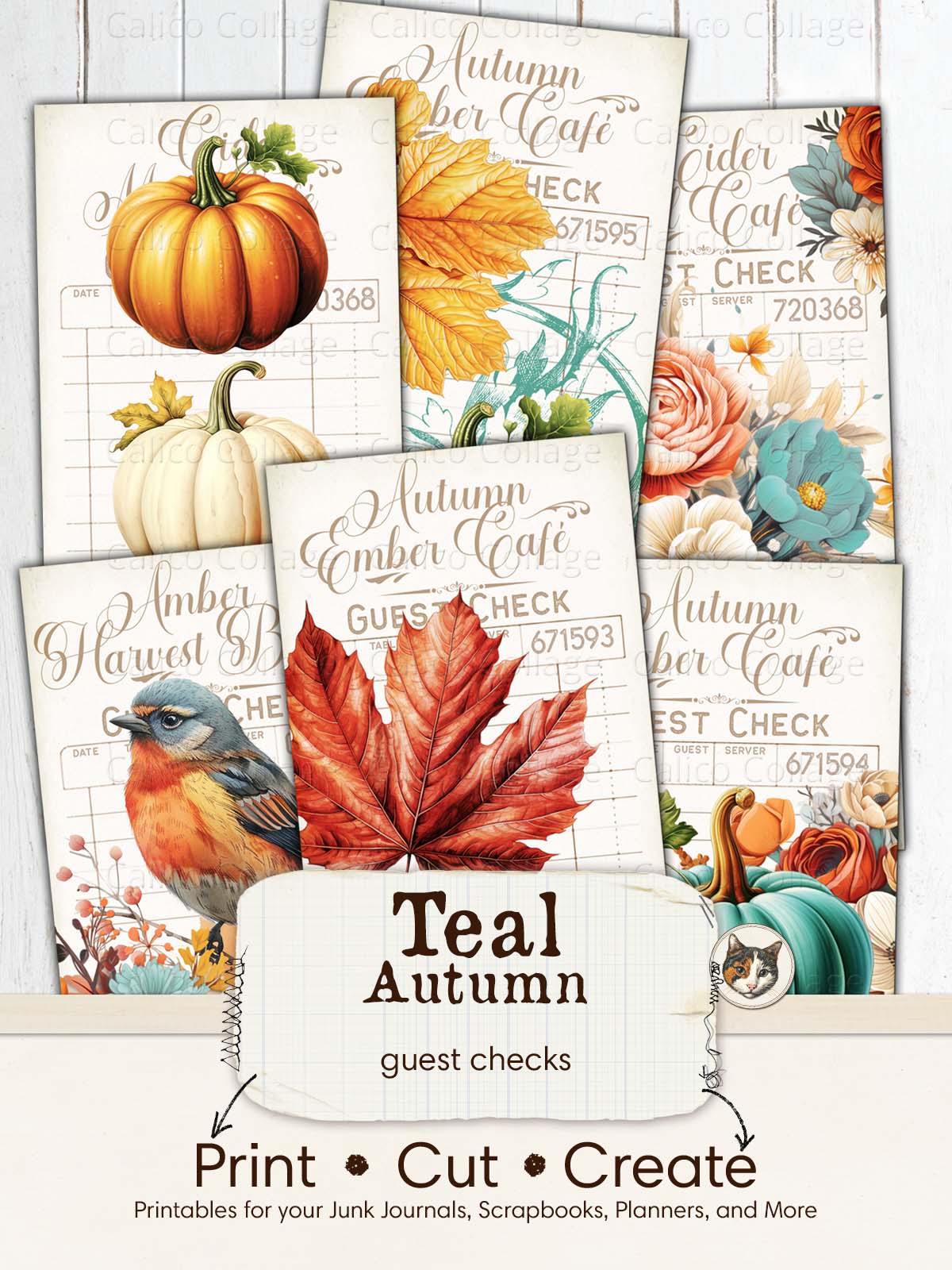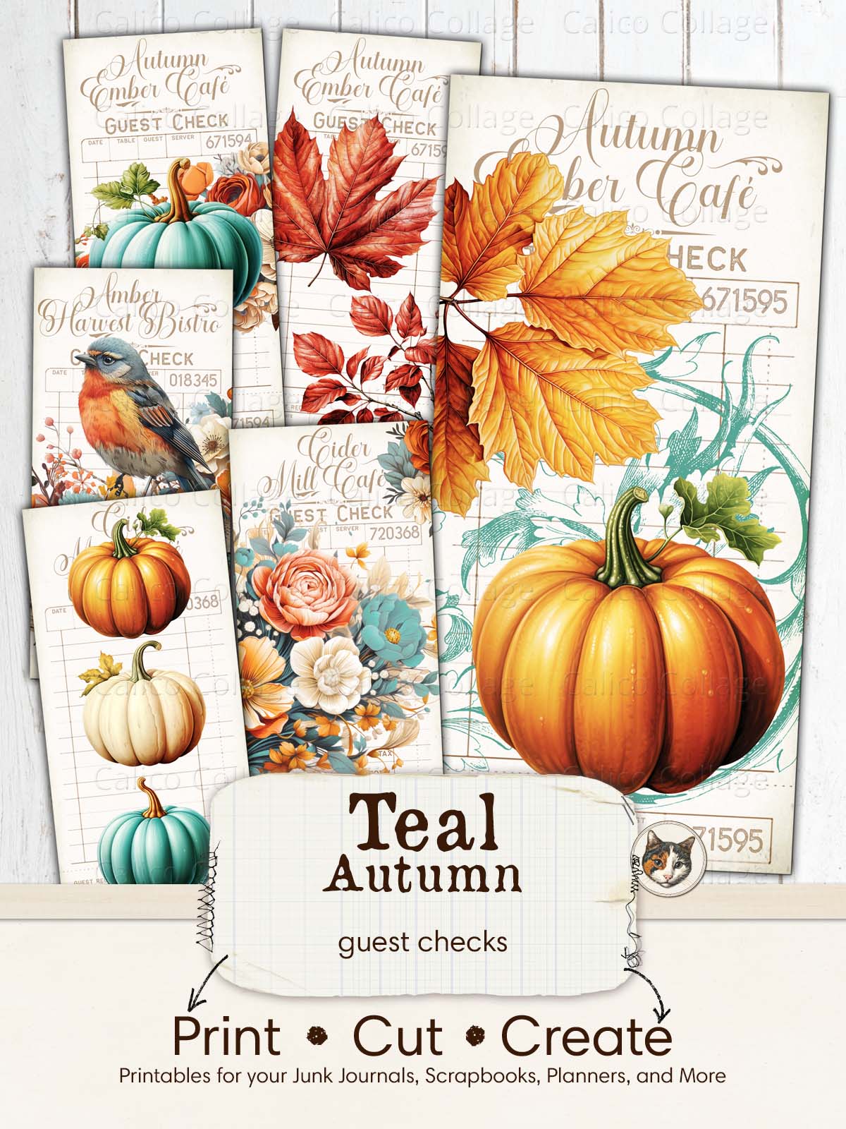 Teal Autumn Guest Checks, Fall Junk Journal Ephemera