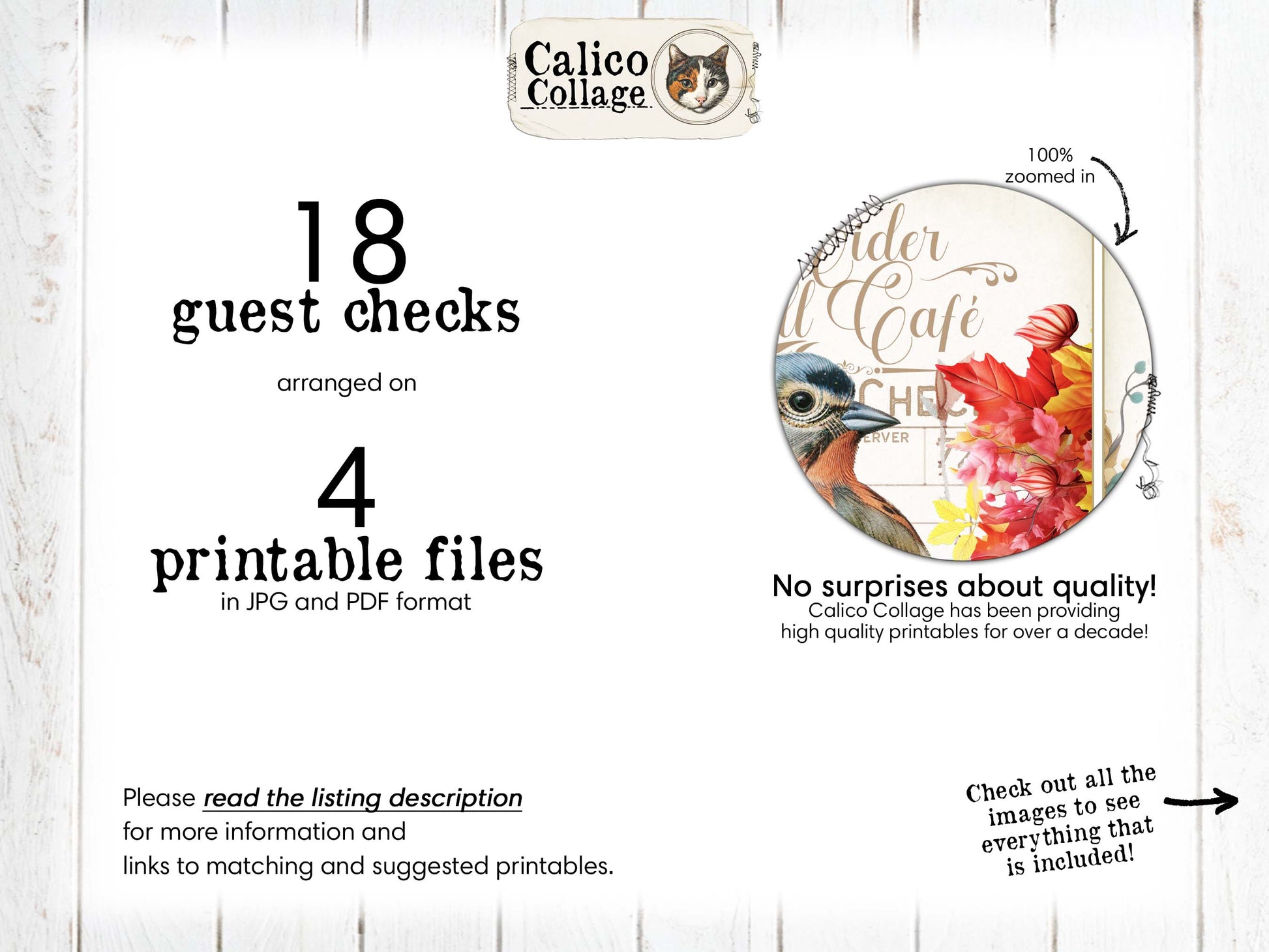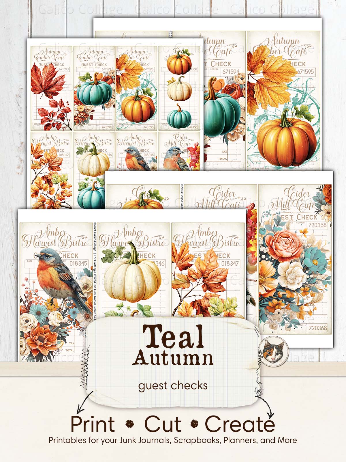 🖨️ Bring a vintage touch to your projects with the "Teal Autumn" Guest Checks. These printable guest checks feature beautiful autumn designs in teal and orange, perfect for adding unique elements to junk journals, scrapbooks, and planners. Print, cut, and create charming seasonal accents!